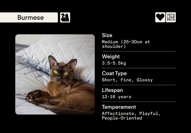 Burmese cats are known for their affectionate nature, sleek coats, and big golden eyes that always seem to be paying attention.