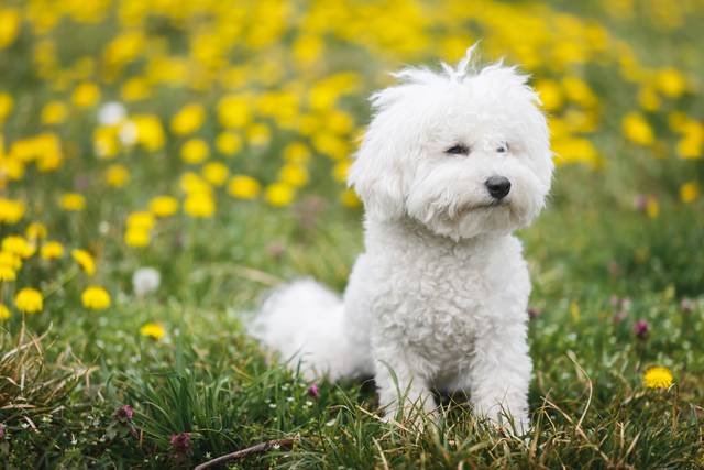 This compact breed typically weighs 5–10 kilograms, with a soft, curly white coat that gives them a cloud-like appearance. They have a rounded head, expressive dark eyes, and a black nose. Their tail is carried over the back, enhancing their elegant and cheerful look.