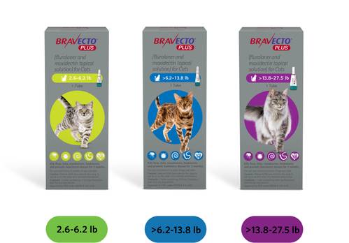 Bravecto Plus is indicated for the prevention of heartworm disease caused by Dirofilaria immitis and for the treatment of infections with intestinal roundworm (Toxocara cati; 4th stage larvae, immature adults and adults) and hookworm (Ancylostoma tubaeforme; 4th stage larvae, immature adults and adults). Bravecto Plus kills adult fleas and is indicated for the treatment and prevention of flea infestations (Ctenocephalides felis) and the treatment and control of tick infestations [Ixodes scapularis (black-legged tick) and Dermacentor variabilis (American dog tick) and Haemaphysalis longicornis (Asian longhorned tick)] for 2 months in cats and kittens 6 months of age and older and weighing 2.6 lb or greater.